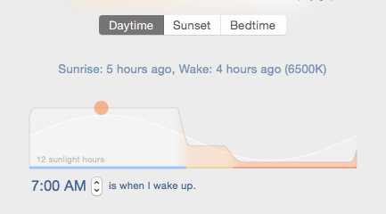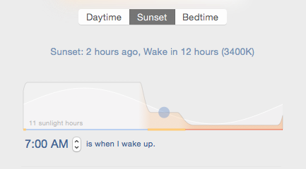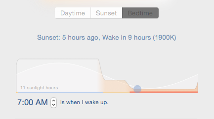 The Bedtime setting changes with your wake time. It removes as much alerting lite from your screen as possible so that yous can feel your body growing tired. You can become to sleep anytime with f.lux - whenever you feel sleepy.